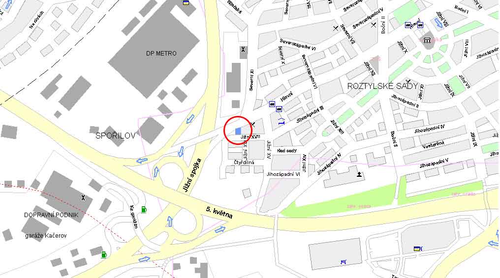 mezi zástavbu. Tou odbočte a hned první ulicí opět doprava. Jeďte na konec ulice a zaparkujete přímo před naší budovou. Na mapě je označena kroužkem